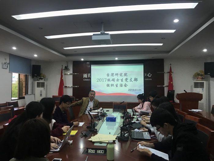 2019年3月5日上午十点,台湾研究院2017级硕士生党支部在院507学术报告厅召开了组织生活会暨民主评议党员大会。本次生活会由支部书记姚雪琳同志主持,台湾研究院党委副书记陈文老师出席指导本次会议,支部在校党员参加此次组织生活会。