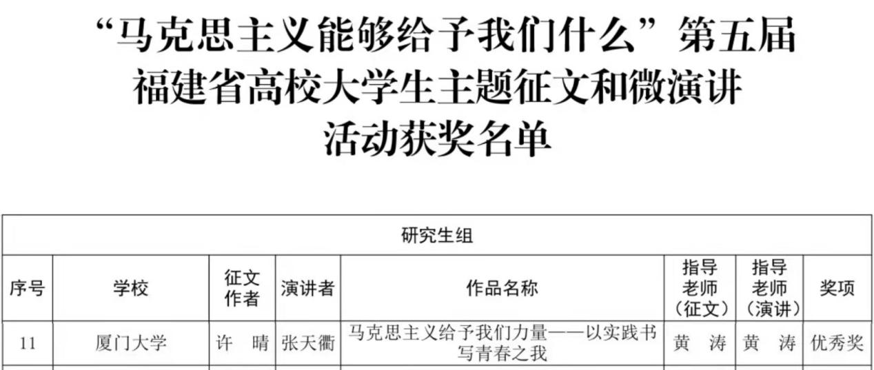 日前,中共福建省委教育工委公布“习近平新时代中国特色社会主义思想大学习领航计划”系列主题活动获奖名单。其中,由我院2020级文学所硕士研究生许晴撰写、2020级经济所博士研究生张天衢演讲的作品《马克思主义能够给予我们力量——以实践书写青春之我》夺得系列活动“‘马克思主义能够给予我们什么’第五届福建省高校大学生主题征文和微演讲”研究生组优秀奖。