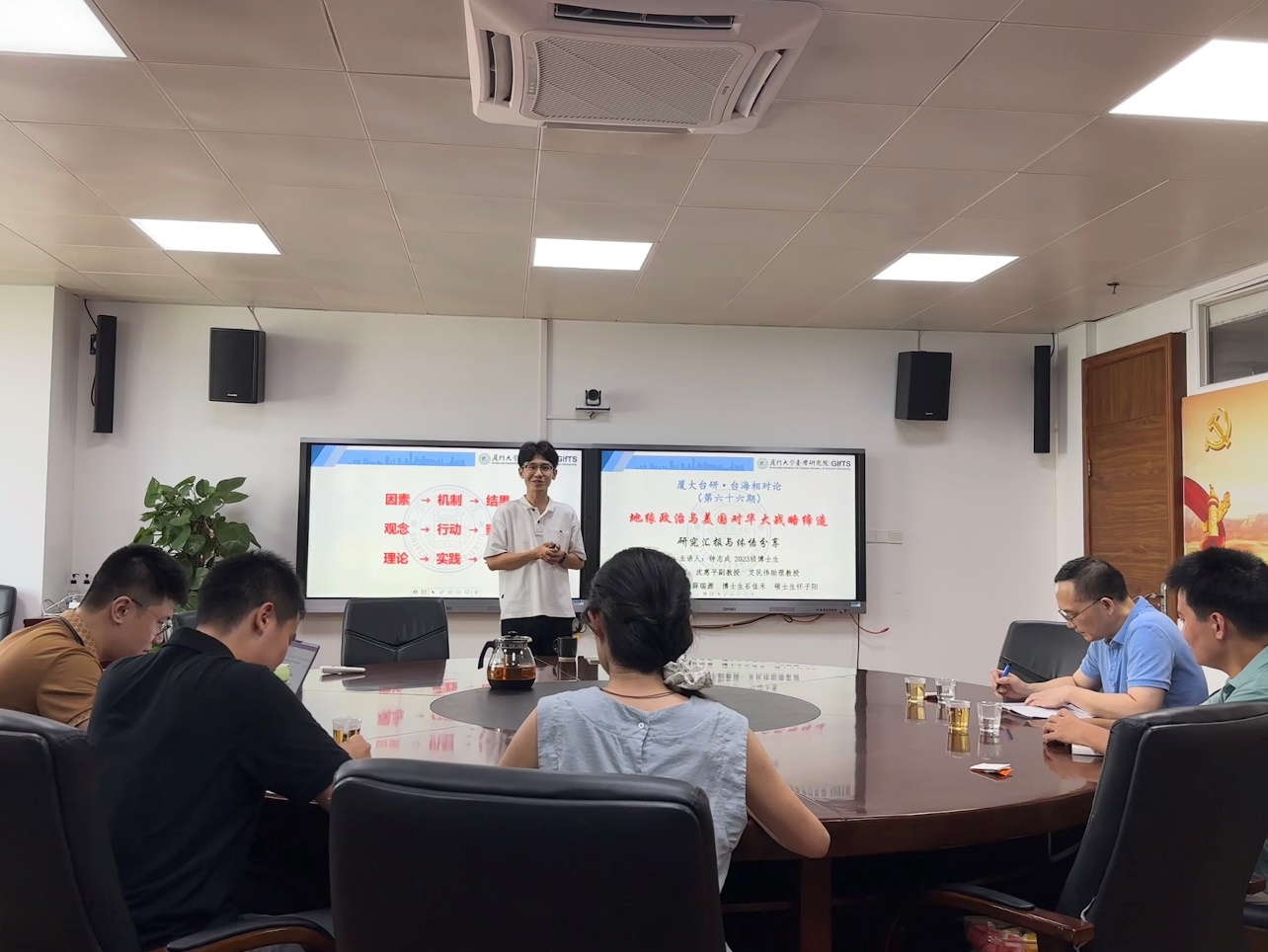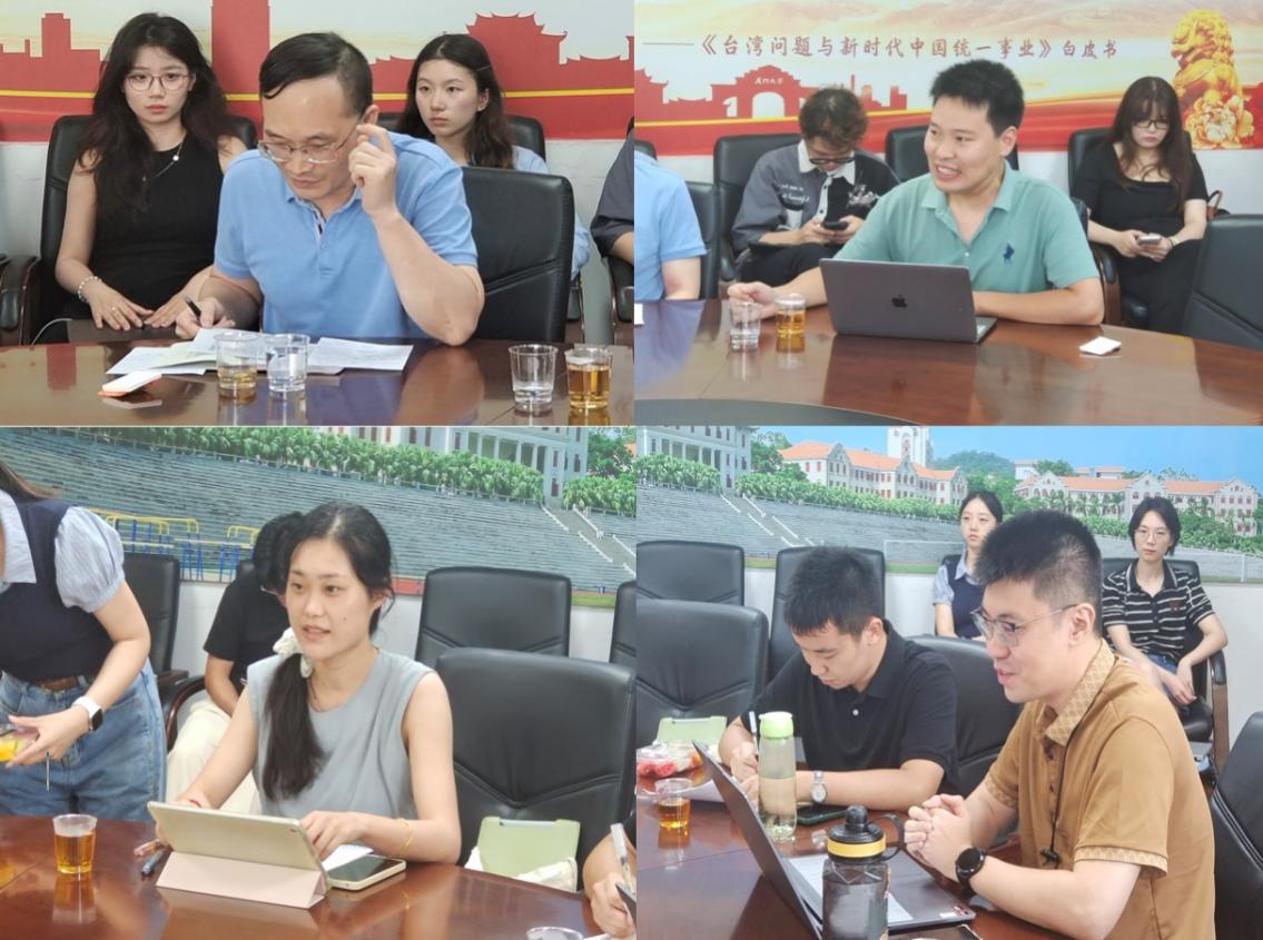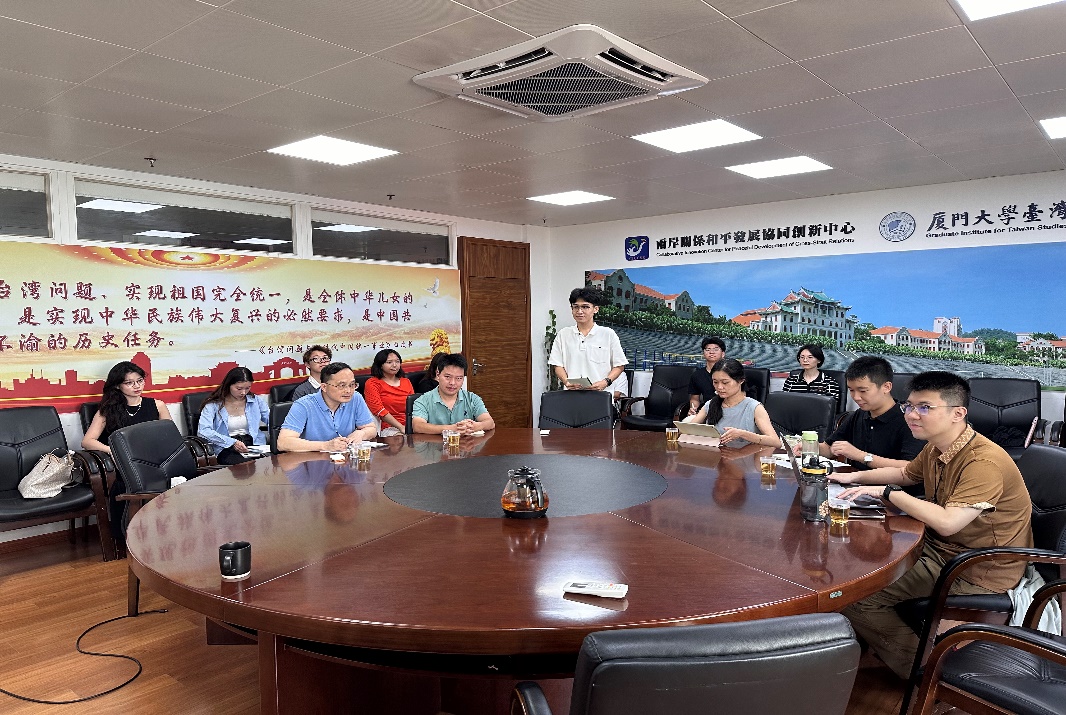 9月12日下午,第六十六期“台海相对论”学术沙龙在厦大嘉庚四418会议室举行。本次沙龙的主题是《地缘政治与美国对华大战略缔造:研究汇报与体悟分享》,由厦门大学台湾研究院2023级博士生钟志成主讲,台湾研究院沈惠平副教授、艾民伟助理教授担任评议嘉宾,我院2022级博士生薛瑞源、石佳禾及2024级硕士生怀子阳在场对谈,另有数名师生参与讨论。