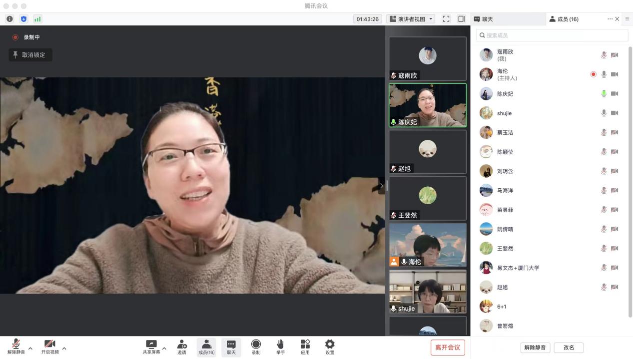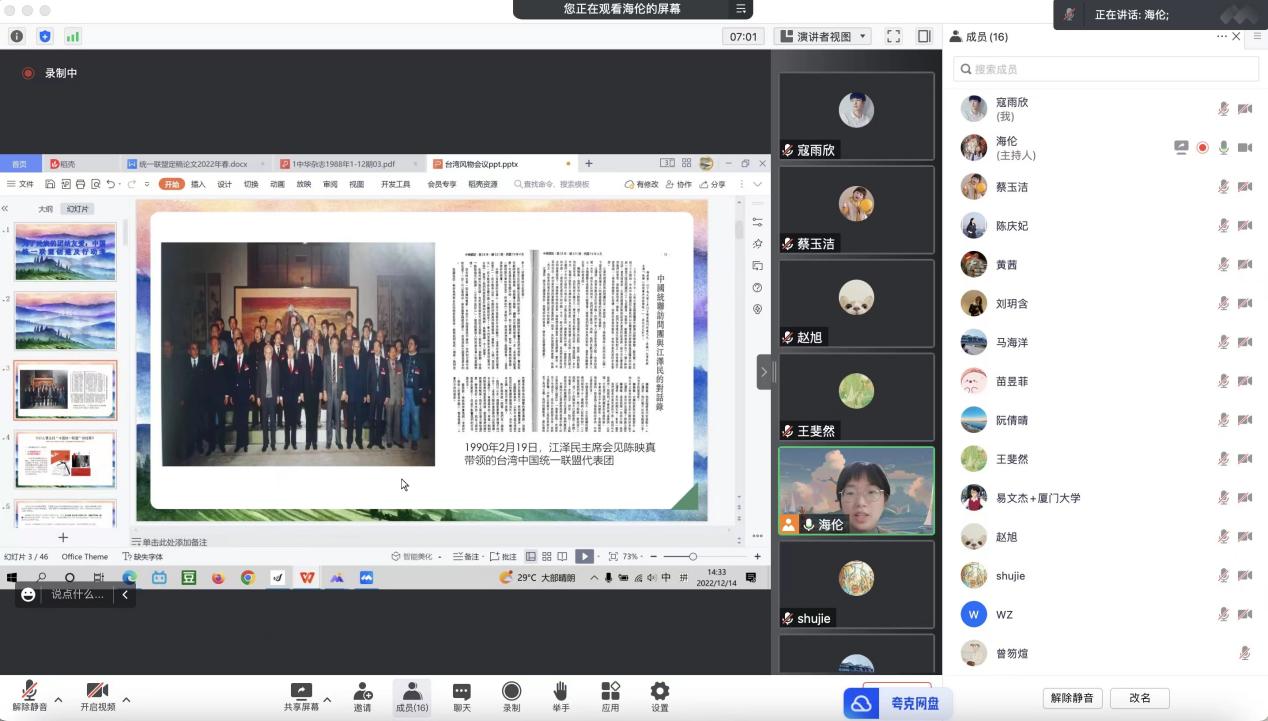 2022年12月14日下午,第62期“台海相对论”学术沙龙以线上形式在腾讯会议室举行。本期沙龙的主题是《为了民族的团结友爱:中国统一联盟创建考》,由我院文学所2019级博士生邵海伦主讲,华东师范大学博士生王斐然参与评议,台湾研究院文学所副所长吴舒洁助理教授、华侨大学陈庆妃教授出席,本次沙龙共吸引校内外师生共计十六人参加。