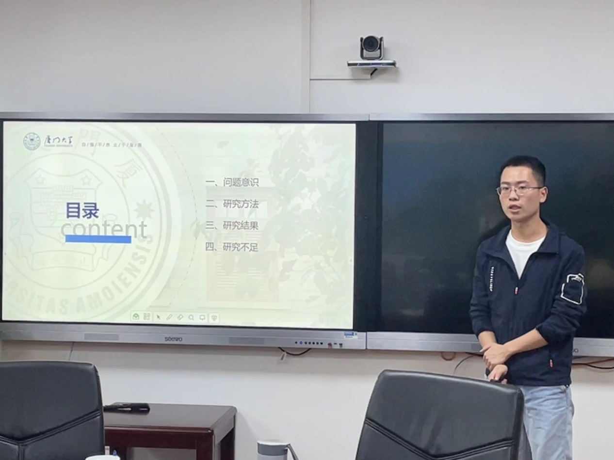 陈尤海同学首先从问题意识、研究方法、研究结果和研究不足等四个方面对文章进行分享。他指出,台湾地区“大法官”对台湾地区宪制性规定的解释活动是“法理台独”风险的重点场域,全面掌握“大法官”行使解释权的程序规则有助于认识解释权的运行规律。以有关“司法院解释”效力的案件为例展开研究,深入分析“大法官”行使程序自主权的实践及其特点,揭示“大法官”行使程序自主权对“释宪”制度产生的影响,并评估“大法官”程序自主权的走向,有助于为反对和遏制“法理台独”分裂活动建立相应的理论储备。