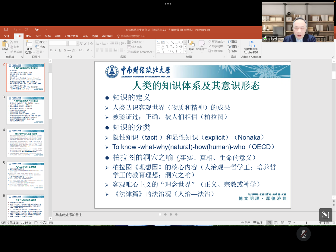 讲座伊始,李鹏院长对江河教授作客线上演讲表示欢迎和感谢,并向与会师生介绍了江河教授的专业背景和研究方向。在讲座中,江河教授从人类的知识体系及其意识形态、知识洞穴中的人类生存危机、人类三大知识体系概述、自然法与实证法的渊源与发展脉络、四大社会科学学科之辩证关系、人类的生存危机及其关联性法律问题、自然法复兴与人类的幸存等多个方面就演讲主题进行了细致而深入的阐述。