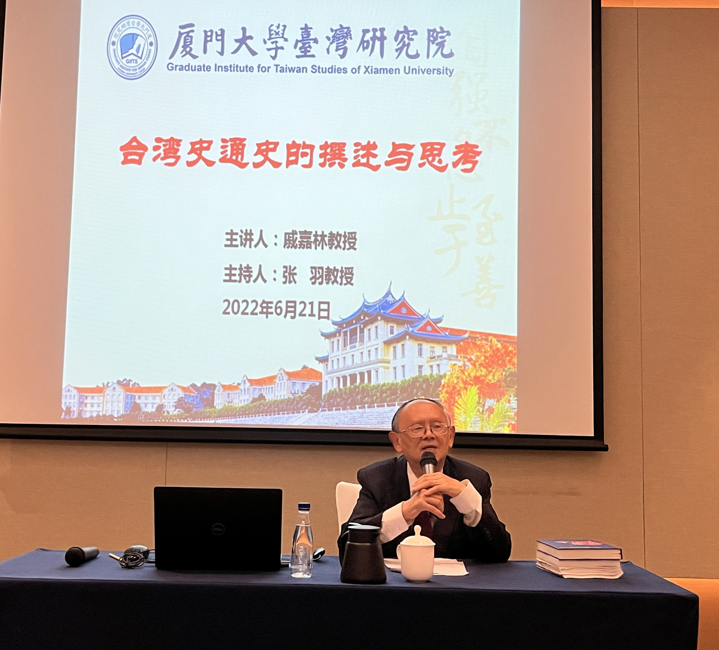 6月21日下午,于厦门佰翔五通酒店三楼格物A厅,台湾佛光大学、世新大学教授、中国统一联盟党主席戚嘉林应邀为我院师生作“台湾史通史的撰述与思考”的学术讲座。本场讲座由台湾研究院副院长张羽教授主持,邓孔昭教授、朱双一教授、陈小冲教授、陈忠纯教授、黄俊凌副教授、陈思副教授、王玉国助理教授及我院各所硕博士生参加。