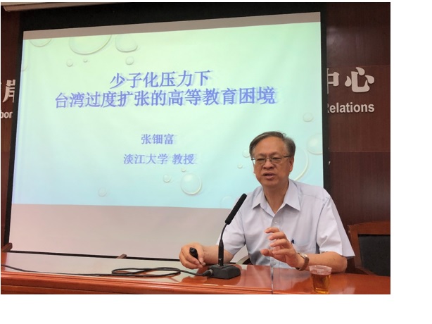 6月24日上午,应我院两岸关系研究所的邀请,台湾淡江大学学习与教学中心执行长张钿富教授在我院五楼会议室举办专题讲座。张教授在高等教育规模扩张研究领域颇有建树,是该领域研究的集大成者。本次讲座题为《少子化压力下台湾过度扩张的高等教育困境》,内容丰富,主要介绍了高等教育扩张的理论型态,台湾高等教育规模扩张的现状与未来推估,台湾高等教育规模扩张面临的困境、因素和可能发展路径,以及AI时代高等教育应该发展的核心素养等。讲座结合数据推演、理论反思、现实批判,用前瞻性的学术眼光和现实关怀,对前沿高等教育问题进行剖析,引发在场师生的强烈反响。