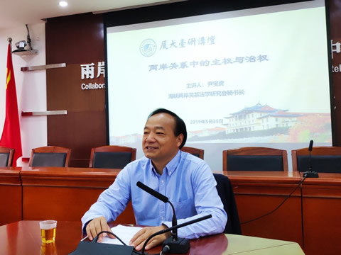 2019年5月25日,“台研法治讲堂”第6季第9期在台湾研究院五楼学术报告厅举行,中国法学会中国法学学术交流中心主任、海峡两岸关系法学研究会秘书长、两岸关系和平发展协同创新中心兼职专家尹宝虎莅临厦门大学,应邀主讲《两岸关系中的主权与治权》。讲座由台湾研究院副院长彭莉教授主持,法律研究所薛永慧副教授、副所长刘文戈老师等师生聆听了讲座。