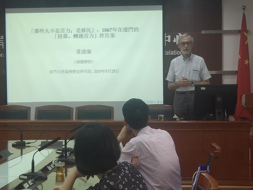 5月28日下午,台研讲坛第二十三讲:“1867年在厦门的‘招募、转运和苦力’”学术讲座在台湾研究院507会议室隆重召开。本次讲座由厦门大学台湾研究院主办,台湾研究院历史所承办,美国里德学院(Reed College)费德廉教授(Fix Douglas)受邀主讲。厦门大学台湾研究院历史所副所长黄俊凌副教授主持本次讲座。台湾研究院历史所所长陈忠纯副教授、文学所朱双一教授、文学所刘奎副教授、法律所薛永慧教授、历史所助理教授王玉国、陈思出席本次讲座。来自台湾研究院的同学们聆听了本次讲座。