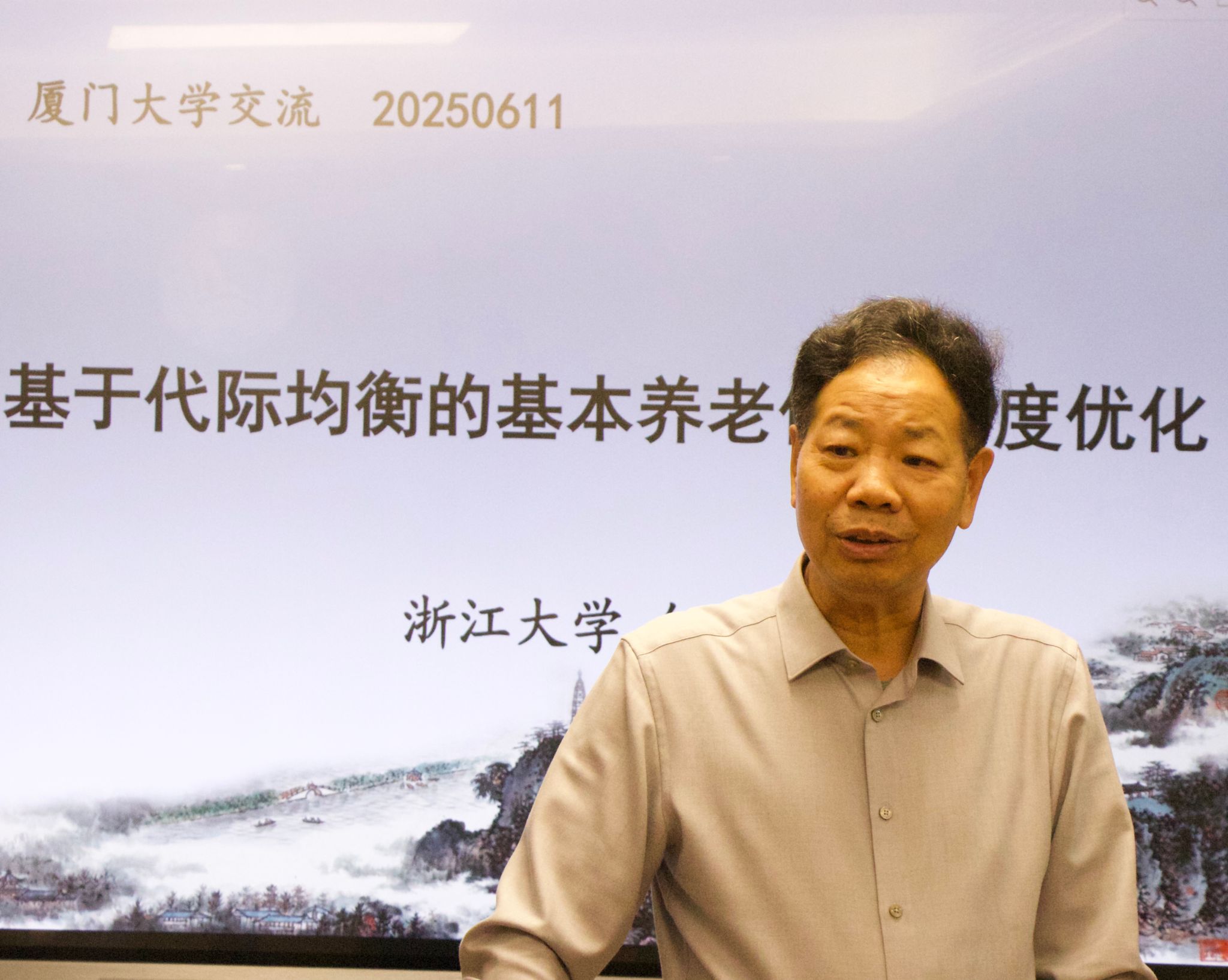 2025年6月11日下午,中国社会保障学会副会长、浙江省人民政府咨询委员会委员、浙江大学公共管理学院何文炯教授应邀莅临我院做学术讲座,题为“基于代际均衡的基本养老保障制度优化”。讲座由厦门大学台湾研究院社会所所长肖日葵主持,我院社会所及厦门大学公共事务学院硕博生出席。