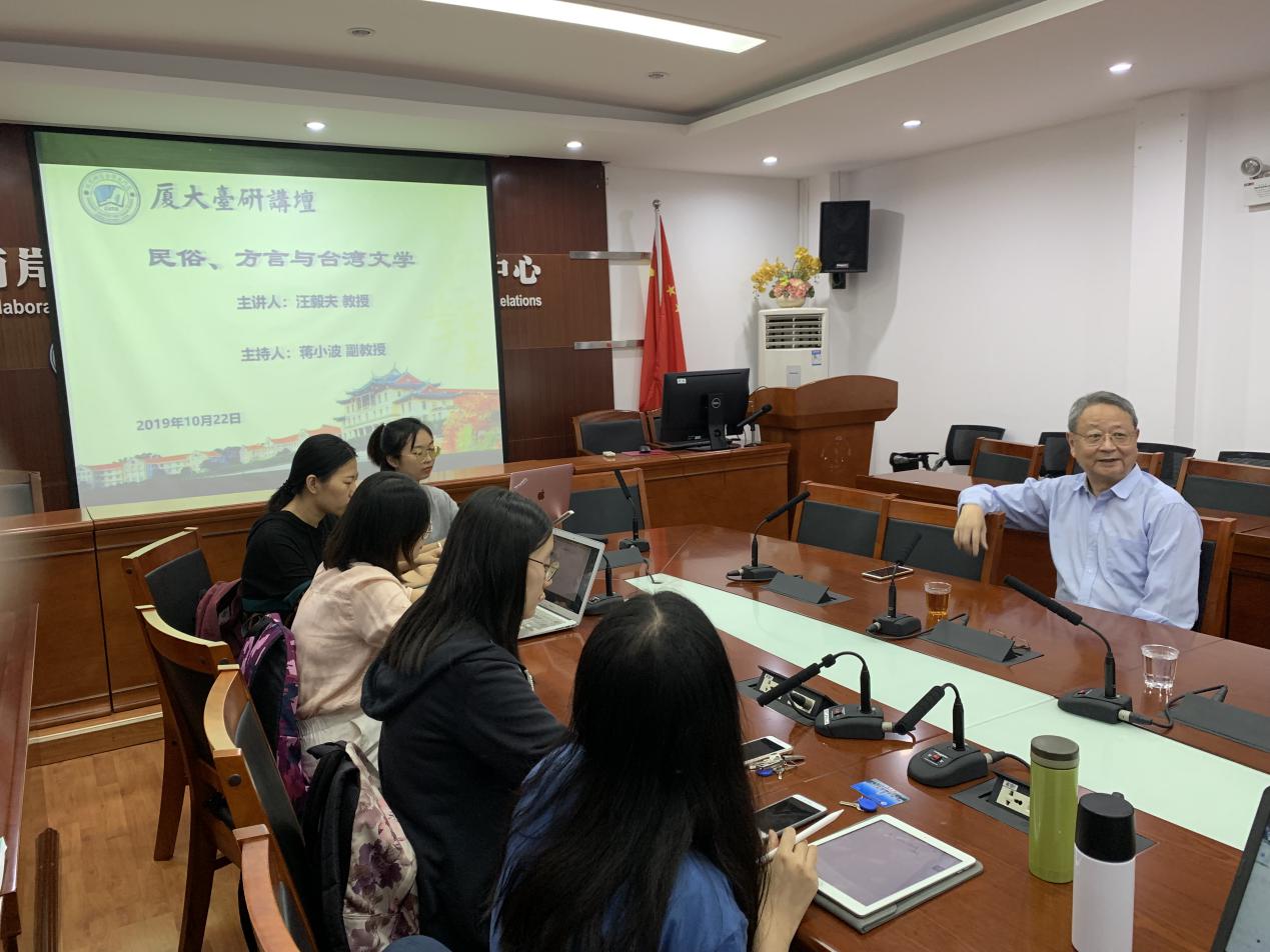 10月22日晚,汪毅夫先生为我院师生作“民俗、方言和台湾文学”主题讲座。本次讲座由厦门大学台湾研究院文学所所长蒋小波副教授主持,副院长张羽教授、历史所所长陈忠纯副教授以及文学所、历史所硕博生到场参加讲座。