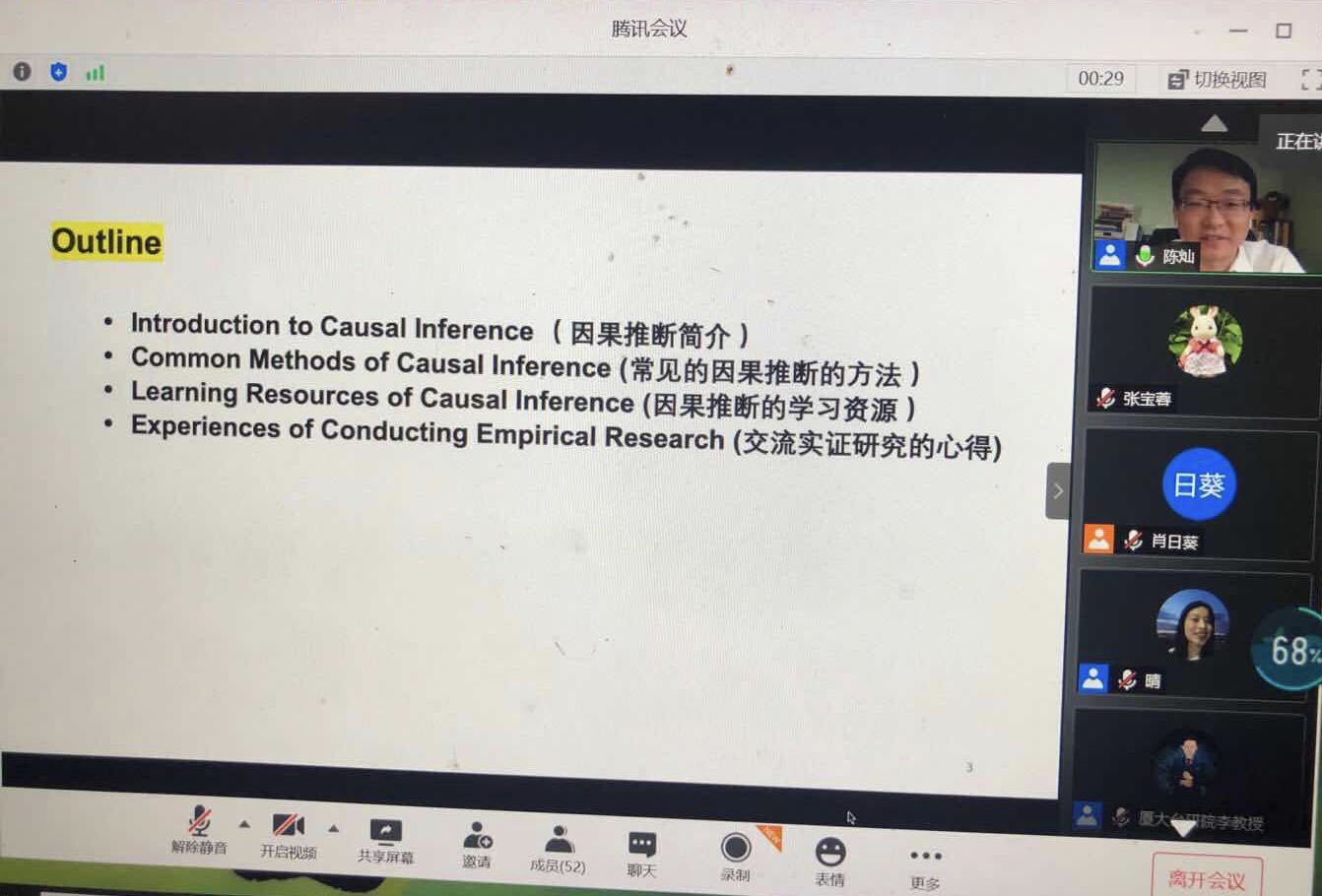 陈灿副教授通过网络为我院师生进行了生动有趣而有逻辑的讲授,吸引了院内院外的师生前来旁听,同学们对其精彩的讲授十分感兴趣,并敬佩其深厚的学科涵养和丰富的学识。陈灿副教授结合现实生活和事件,从因果推断的起源、含义和公式推导过程阐释了因果推断作为国际前沿社会科学定量方法的优势及其使用情境。同时他也结合自身的经历和专业知识,为师生们分享了实证研究的写作规范和要求,以及英文期刊投稿的经历、难点和关键点。这样的方法课程讲座即提升了同学们的思维能力,也给予了同学们规范写作和研究更多的启发。
