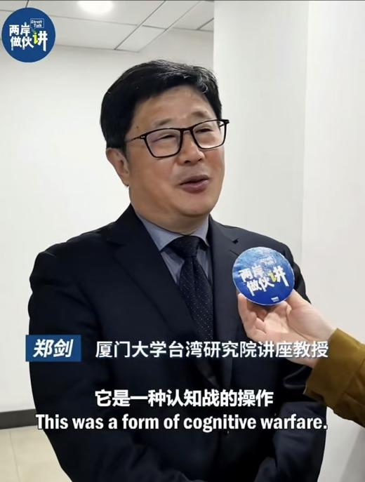 近日,针对赖清德的“双十演说”,厦门大学台湾研究中心讲座教授郑剑表示,台当局炒作大陆欲军演是一种认知战,加剧台海紧张局势并试图将责任推给大陆,倒打一耙。