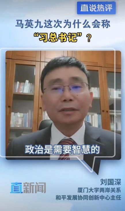4月10日下午,中共中央总书记习近平在北京会见马英九一行。会见中,马英九称呼习近平为“习总书记”,其中细节耐人寻味。对此,两岸关系和平发展协同创新中心主任、厦门大学台湾研究院特聘教授刘国深在接受深圳卫视直新闻采访时表示,政治不仅需要智慧,也需要情商,该称呼是合适且不会有很大争议的,两岸之间要以发展变化的眼光看问题。