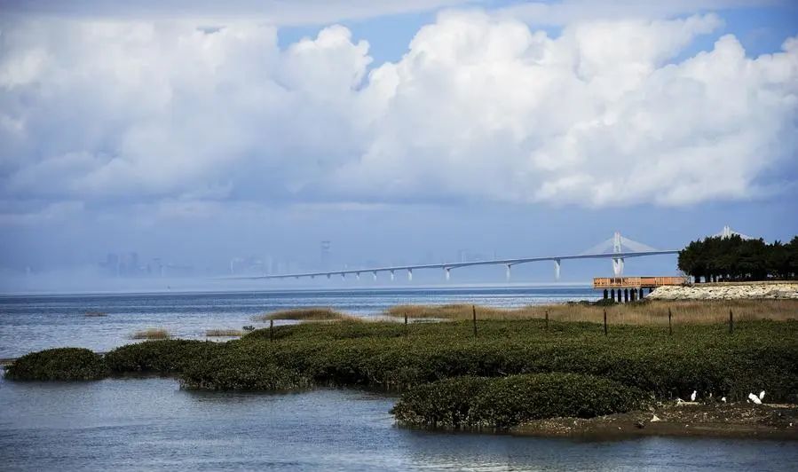 This photo taken on Feb 21, 2024 shows the Kinmen bridge and a view of Xiamen in the distance seen from an estuary in Kinmen.[Photo/Xinhua]
