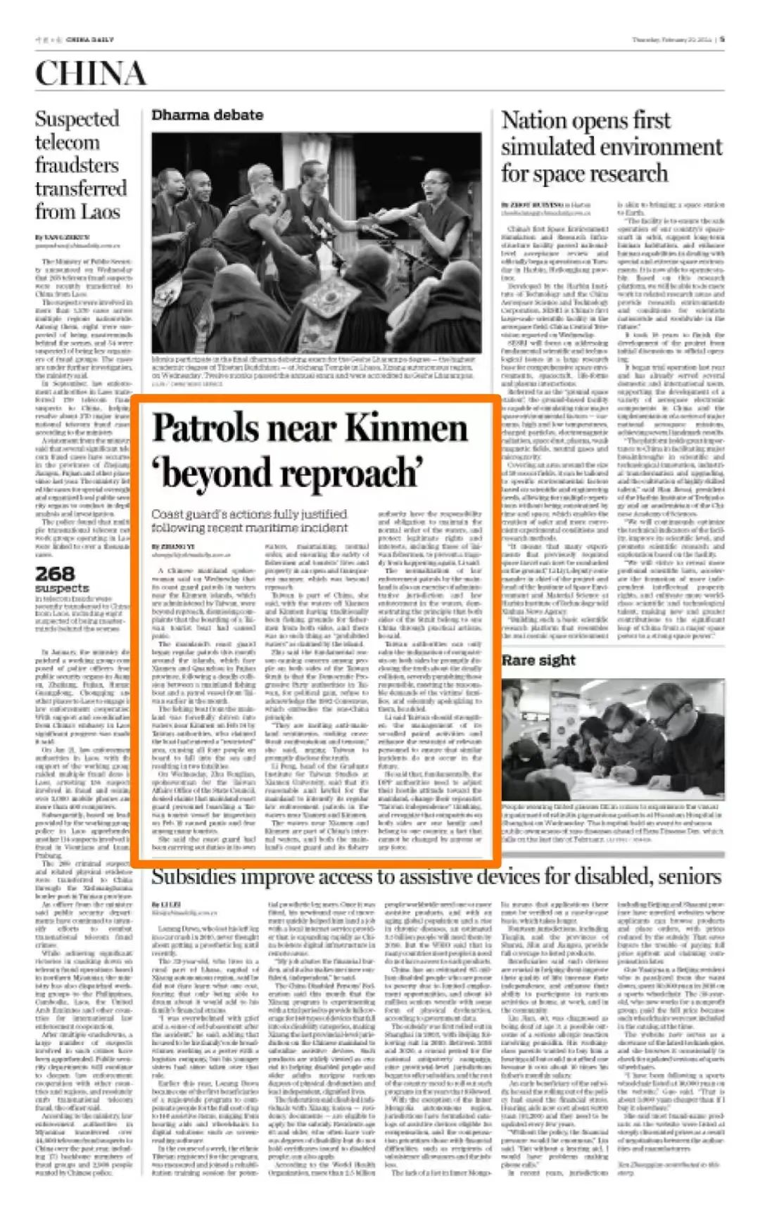 针对“2·14恶性撞船事件”发生后,大陆海警部门开展常态化执法巡查行动。厦门大学台湾研究院院长李鹏教授接受China Daily采访时指出,大陆加强在厦门和金门附近海域的常规执法巡查是合理和合法的。