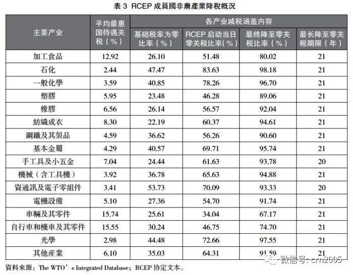 表3:RCEP成员国非农产业降税概况资料来源:The WTO’s Integrated Database;RCEP协定文本。