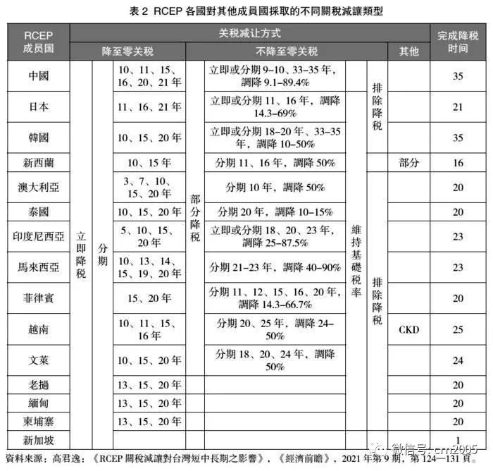 资料来源:高君逸:《RCEP关税减让对台湾短中长期之影响》,《经济前瞻》,2021年第9期,第124—131页。
