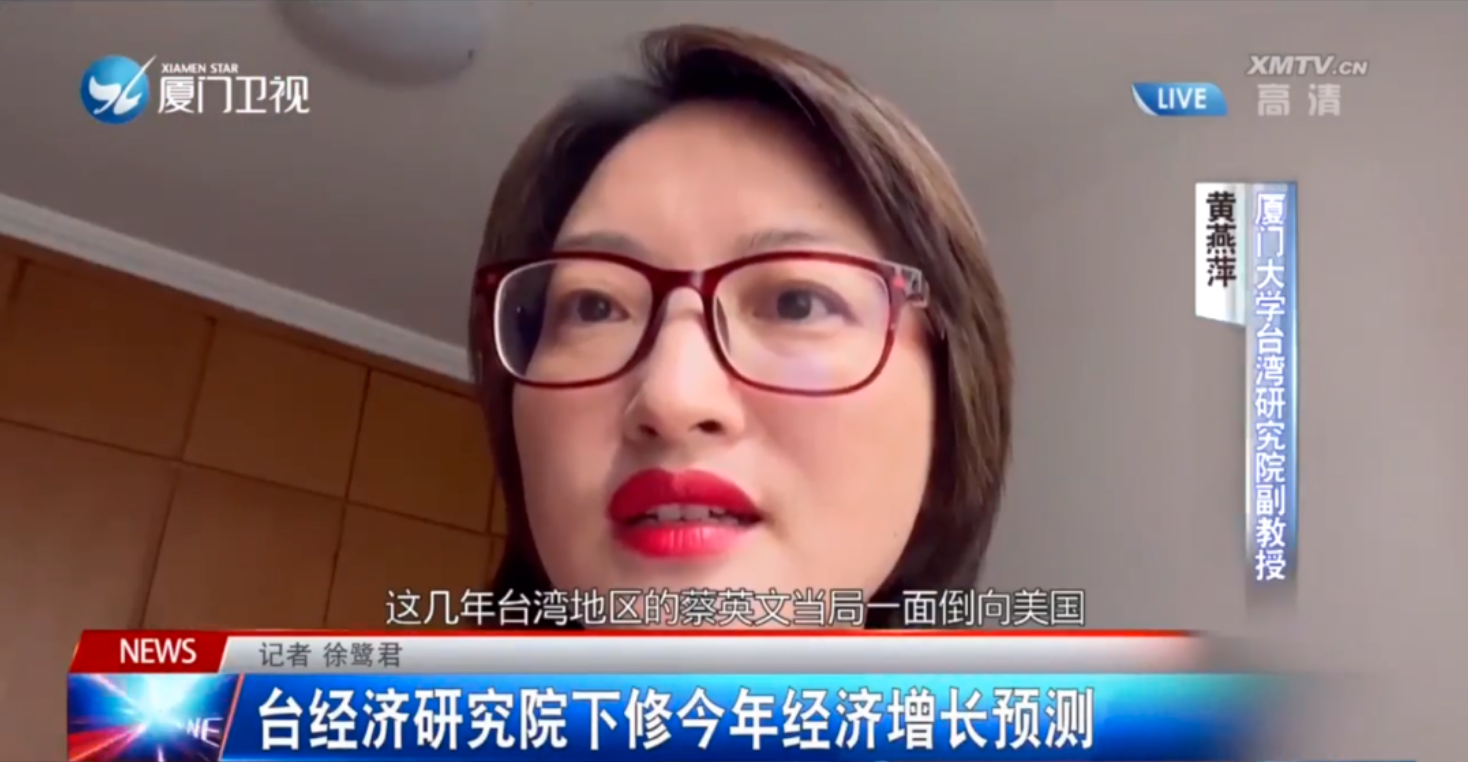 厦门大学台湾研究院副教授 黄燕萍:这几年台湾地区的蔡英文当局一面倒向美国,而这很大程度会加剧台湾经济下行的一个压力,美国为了遏制中国大陆的崛起,把台湾当作棋子来对抗中国大陆,这加剧了两岸关系的恶化和台海形势的紧张,不仅会冲击到两岸经贸关系的发展,从去年四月份开始,台湾地区来自中国大陆的外销订单,就开始大幅度的下降,另外一方面也会恶化台湾岛内的一个投资环境。