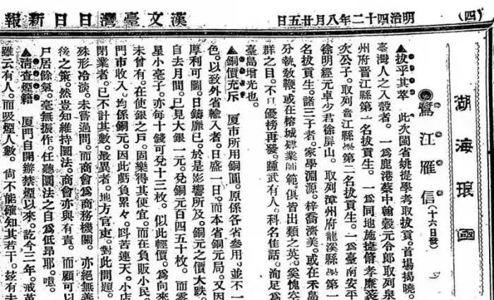 中评社北京12月7日电(作者 汪毅夫)《台湾日日新报》1909年8月25日以《拔乎其萃》为题报道:“此次闽省姚提学考取拔贡,首场揭晓。台湾人入彀者,一为鹿港蔡中翰谷元令郎,取列泉州府晋江县(学)第一名拔贡,一为同地施捷修孝廉菼次公子,取列晋江县学第二名拔贡生,一为台南安平徐明经元卓少君徐屏山,取列漳州府龙溪县学第一名拔贡。诸三子者,家学渊源,梓乔济美。或在禾岛执教鞭,或在榕城肄业师范,俱皆出类之英。奚愧空群之目,不日优榜再发。科名佳话,洵足为台岛增光。”这条旧报旧闻故事多,容我一一道来。