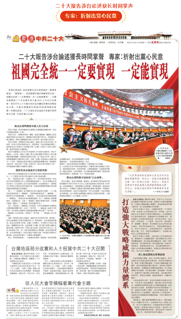 香港文汇报讯 综合新华社及记者刘凝哲、苏榕蓉报道,“国家统一、民族复兴的历史车轮滚滚向前,祖国完全统一一定要实现,也一定能够实现!”中国共产党第二十次全国代表大会16日上午在北京开幕,习近平作二十大报告时的这句掷地有声的表态话音未落,大会全场爆发出长达30秒雷鸣般的掌声。有专家认为,二十大报告涉台论述令参会代表们产生共鸣,折射出党心民意。