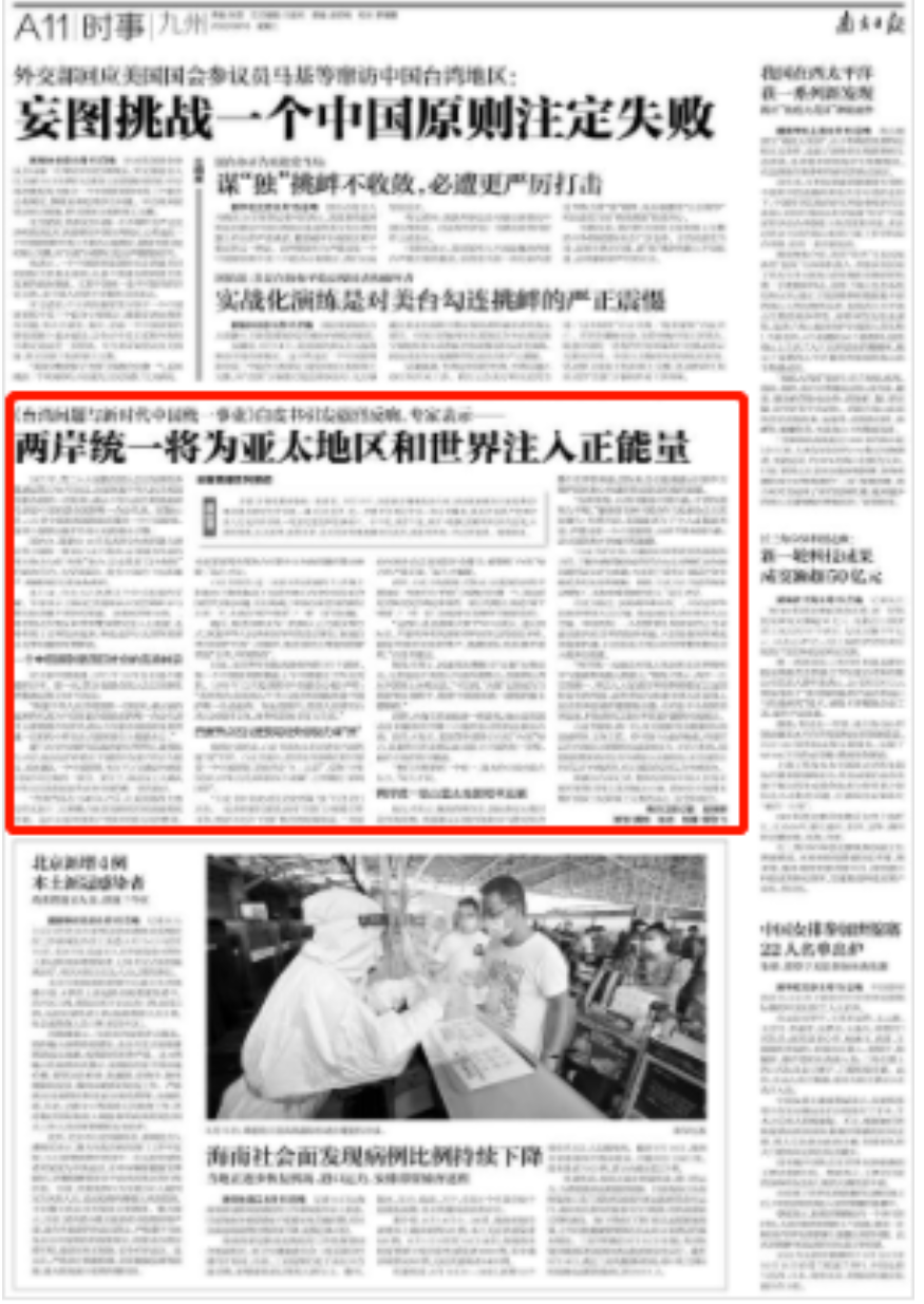 连日来,白皮书在各界人士中引发强烈反响。专家表示,国际社会逐渐认识到台海和平与稳定符合整个世界的利益。实现两岸和平统一,将会给亚太地区和世界繁荣稳定注入正能量,还将有助于全球经济发展、科技进步以及世界贫富分化等问题的有效解决。