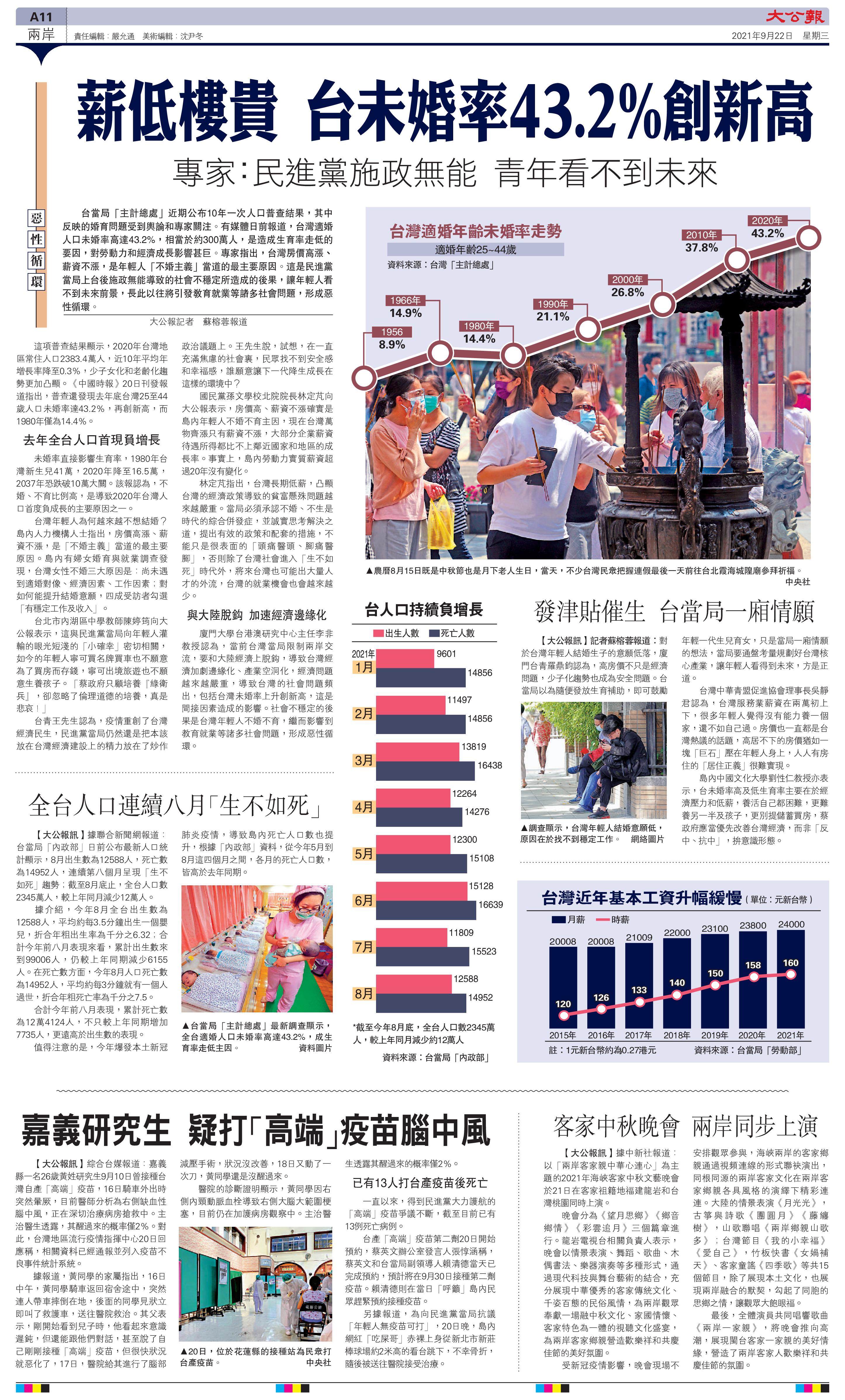 未婚率直接影响生育率,1980年台湾新生儿41万,2020年降至16.5万,2037年恐跌破10万大关。该报认为,不婚、不育比例高,是导致2020年台湾人口首度负成长的主要原因之一。