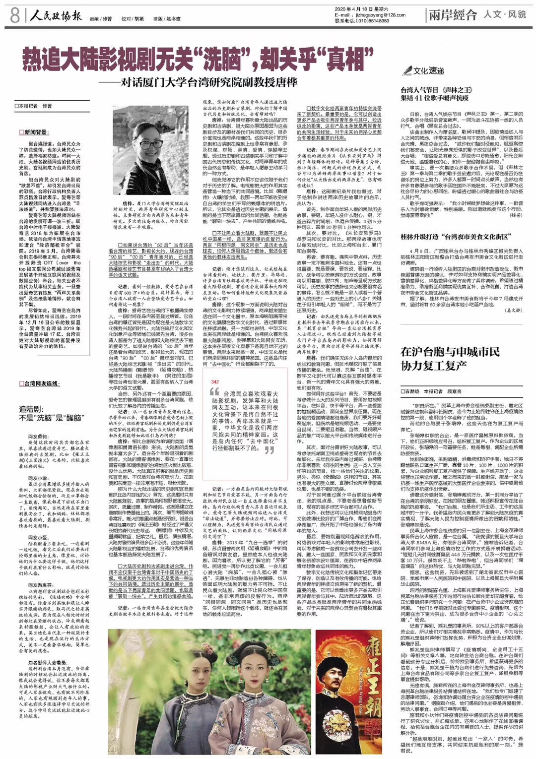唐桦:台湾青年喜欢看大陆出品的历史剧和古装剧,很大部分原因是因为这些剧目涉及的题材是我们共同的历史,很多价值观也是两岸相通的。这些年我们的历史剧和古装剧在编剧上也非常有意思,涉及权谋、职场、亲情、爱情、穿越等主题。透过历史剧和古装剧来学习和了解中国古代历史和传统文化,对两岸青年的成长当然会有帮助,是年轻人愿意主动学习的一种方式。