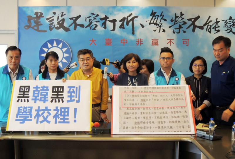 图:国民党台中市议会党团17日举行记者会,抨击中学老师出考题竟然“黑韩”,直斥太离谱,把政治立场带进校园/“中央社”