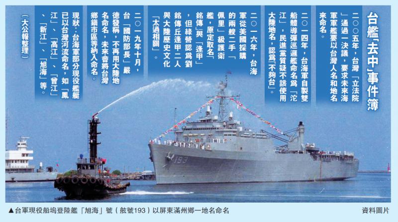 国民党1946年公布“海军舰艇命名原则”,规定巡洋舰以省市命名、驱逐舰以人名命名、潜艇以江湖河川命名、护卫舰艇以县名命名、辅助舰艇以山名命名等,像“康定”级几艘军舰被命名为“康定”“西宁”“昆明”和“武昌”等。此次民进党当局明确不再用大陆地名命名军舰,两岸专家直指,这是台当局在军事上搞“去中国化”。
