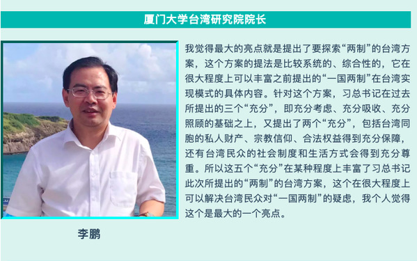 我院李鹏院长接受央广客家天地采访时表示,“习近平总书记的重要讲话的最大亮点就是提出了要探索“两制”的台湾方案,这个方案的提法是比较系统的、综合性的,它在很大程度上可以丰富之前提出的“一国两制”在台湾实现模式的具体内容。针对这个方案,习近平总书记在过去所提出的三个“充分”,即充分考虑、充分吸收、充分照顾的基础之上,又提出了两个“充分”,包括台湾同胞的私人财产、宗教信仰、合法权益得到充分保障,还有台湾民众的社会制度和生活方式会得到充分尊重。所以这五个“充分”在某种程度上丰富了习近平总书记此次所提出的“两制”的台湾方案,这个在很大程度上可以解决台湾民众对“一国两制”的疑虑,我个人觉得这个是最大的一个亮点。 ”