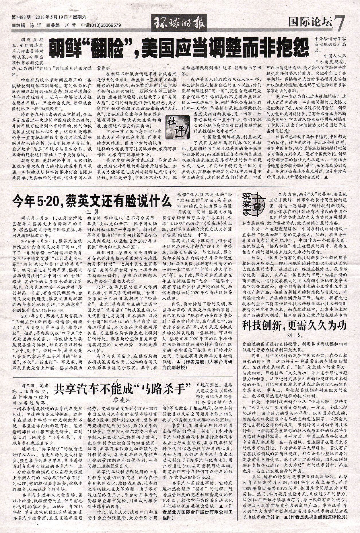 环球时报5月19日电(记者:陈洋)正值台湾地区领导人蔡英文上台将满两周年,我院经济所副所长王勇副教授以《今年5.20,蔡英文还有脸说什么》为题发表文章,回顾了两年来蔡的执政状况并提出看法。